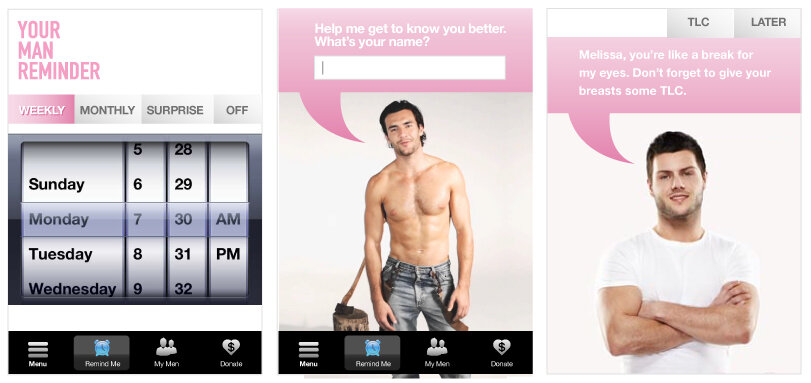 This mobile app enables users to regularly reminded and learn more about breast self-exam (BSE) in a quite genuine and engaging way. Users can choose “the right man,” from the superstar athlete to the boy-next-door, who will remind and teach them about b-health and 'TLC' (touch, look, and check) on a regular basis. We designed to provide users with the appropriate backstory and preparation to get the most out of their BSE, increasing the likelihood of turning them into breast-health expert.